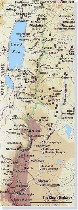 Op de wegwijzer staat daar: Kings Highway. -info- Deze weg loopt van Petra naar Amman. Vlak voor Amman slaat men linksaf, net zoals Jozua en het volk indertijd deden. Daar is nu de Allenby Bridge over de Jordaan, tegenover de steden Jericho en Gilgal. Indertijd trokken de kinderen Israëls daar de Jordaan over. Men zal opnieuw overtrekken om zich vervolgens naar het verwoeste Jeruzalem te begeven. Dit alles zal korte tijd na de 70-ste week van Daniël plaatsvinden.