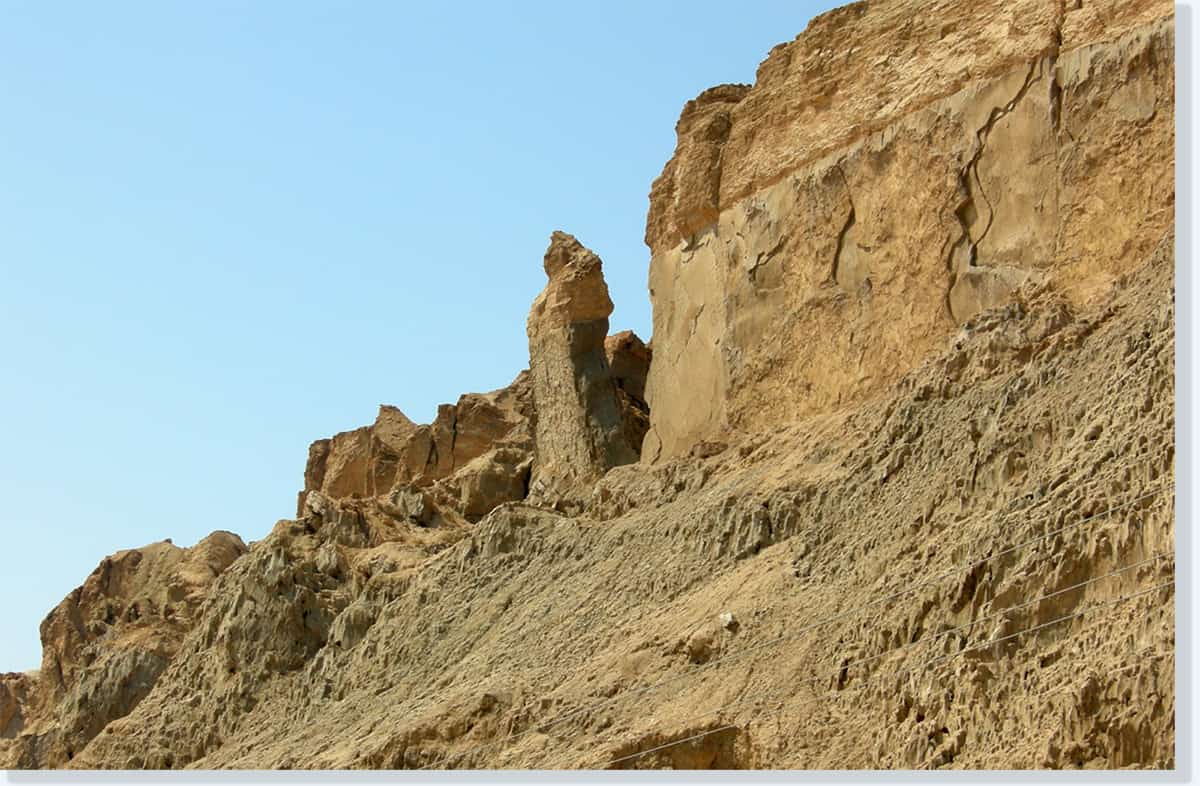 Gips is verbrande kalksteen. Het is wit van kleur en zeer zacht. As is in de Bijbel een beeld van dat wat veroordeeld is en zout is een beeld van het Woord van God. Door het Woord des Heeren is het oordeel daar gekomen. In het hele gebied is het doodstil, er groeit niets meer en er wordt geen leven gevonden. Tijdens de verwoesting van Sodom en Gomorra kwam zwavel omhoog door vulkanische activiteiten. Deze brandende zwavelbolletjes hebben Sodom en andere steden rond de Dode Zee in brand gezet. Als we nu kijken naar de resten van Sodom, dan zien we een soort lagen in de “bergwanden” die ontstaan zijn door verzinking. Deze lagen zijn gegolfd. Ze zijn ontstaan door de verschillende bouwmaterialen die toen gebruikt zijn. Door de enorme hitte en druk zijn ze uitgezet.